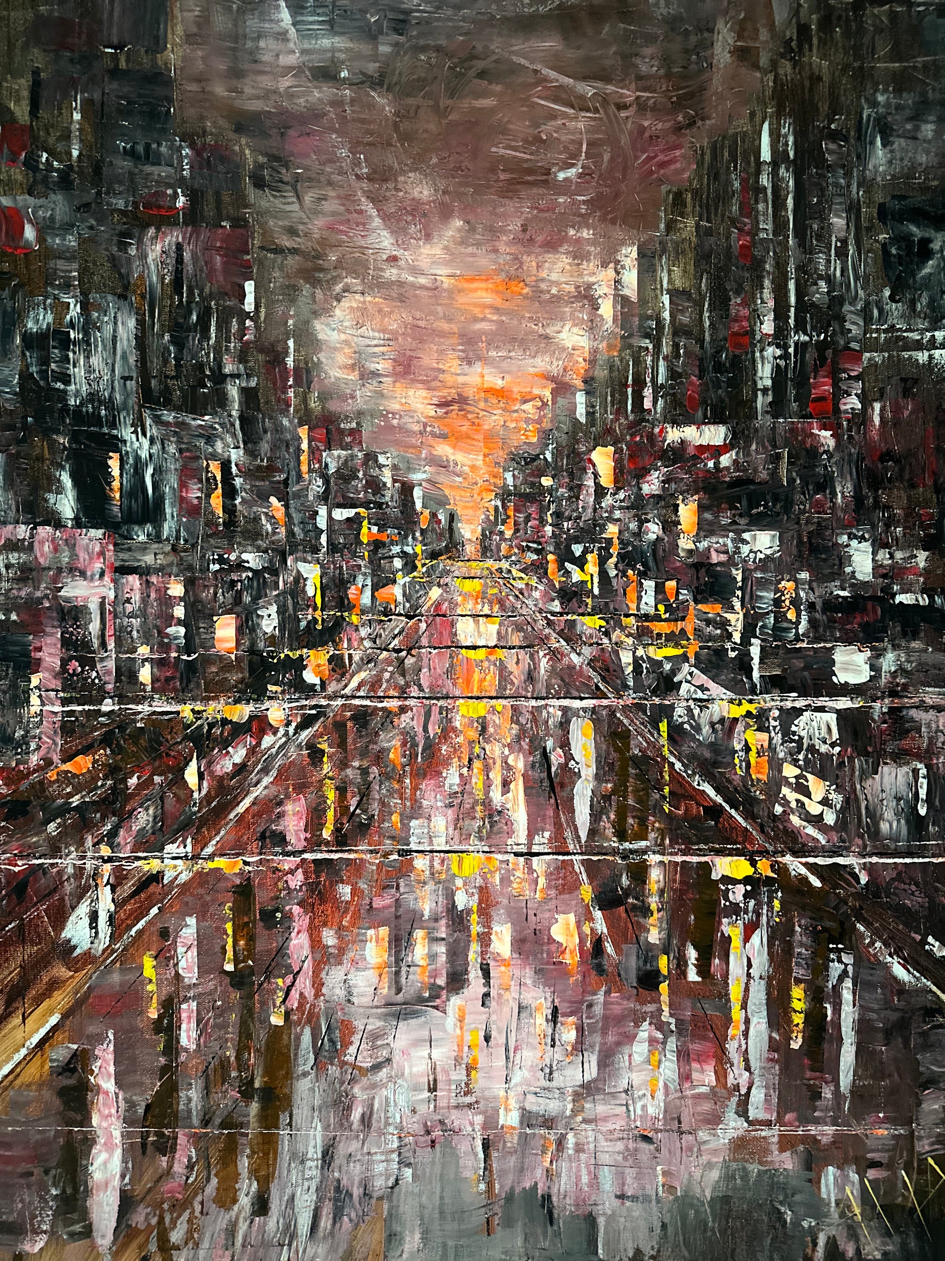 The piece carries the energy of abstract urban life — vivid, deep, and powerful.