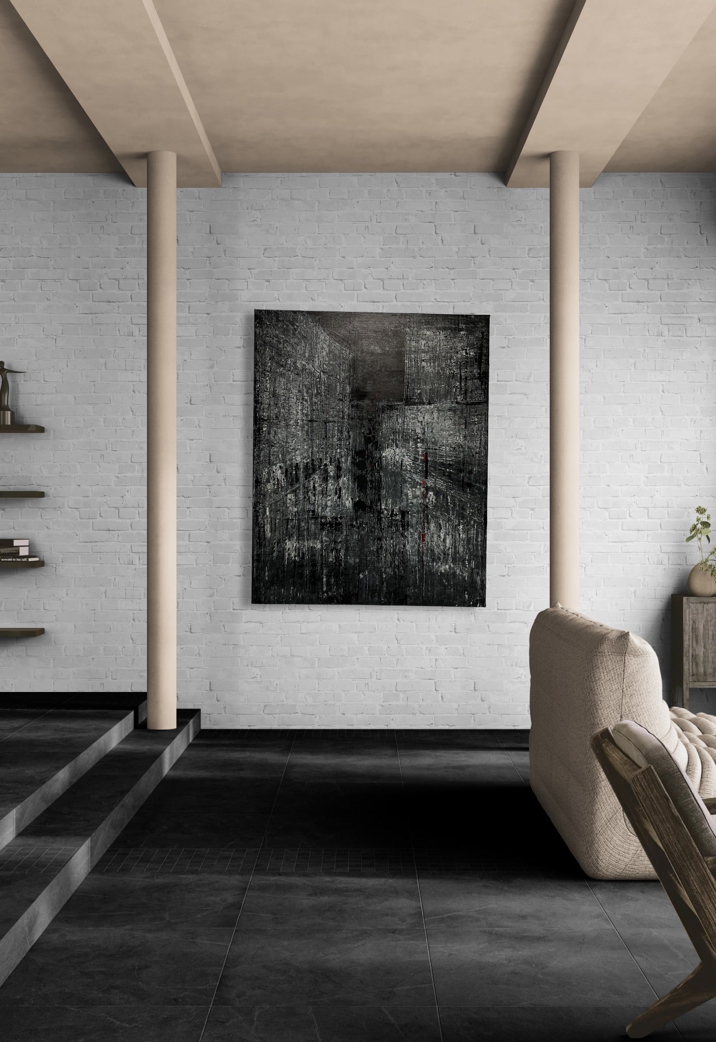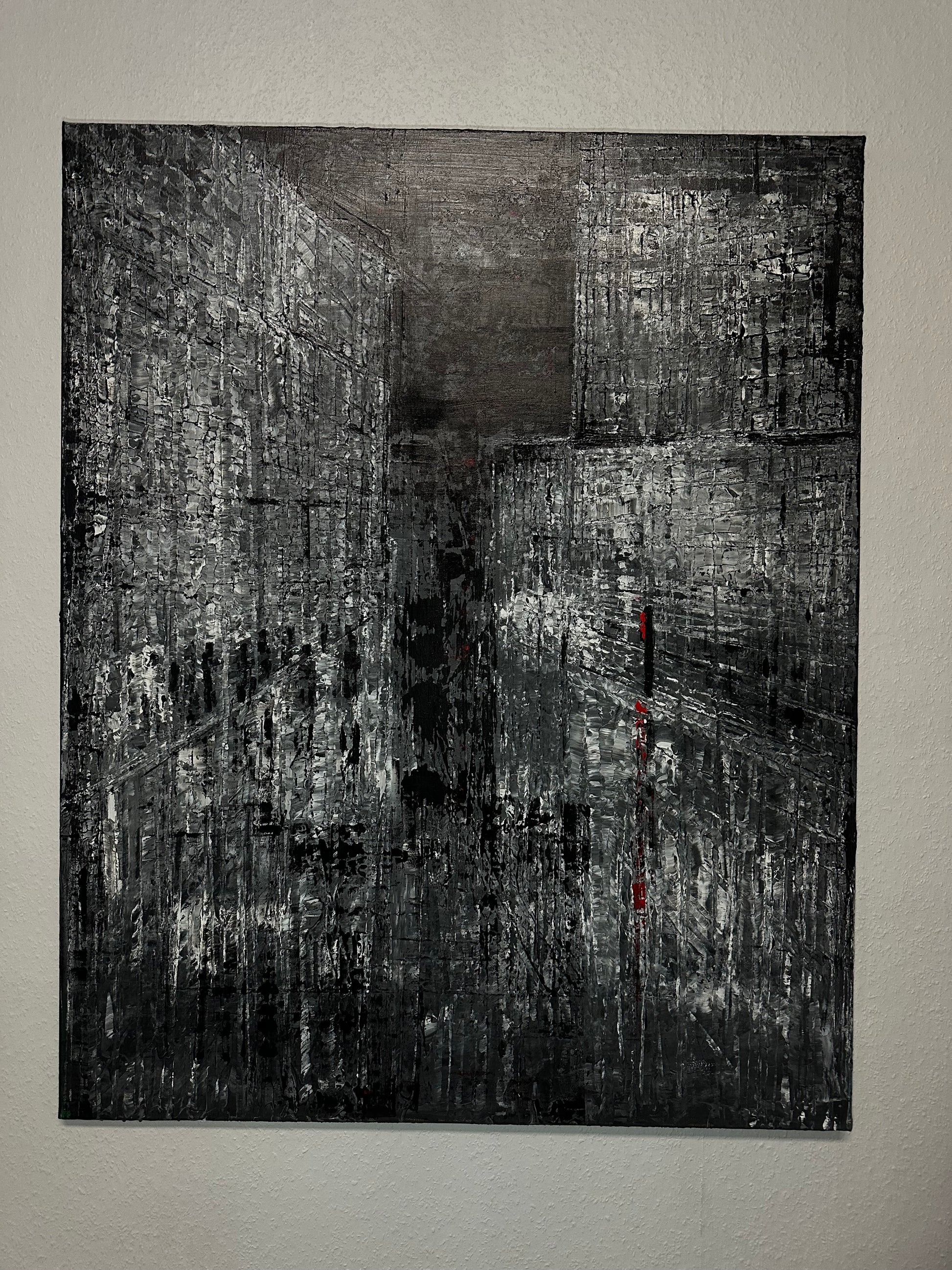 This original acrylic painting on high-quality canvas explores the flow of human life through an urban metaphor.